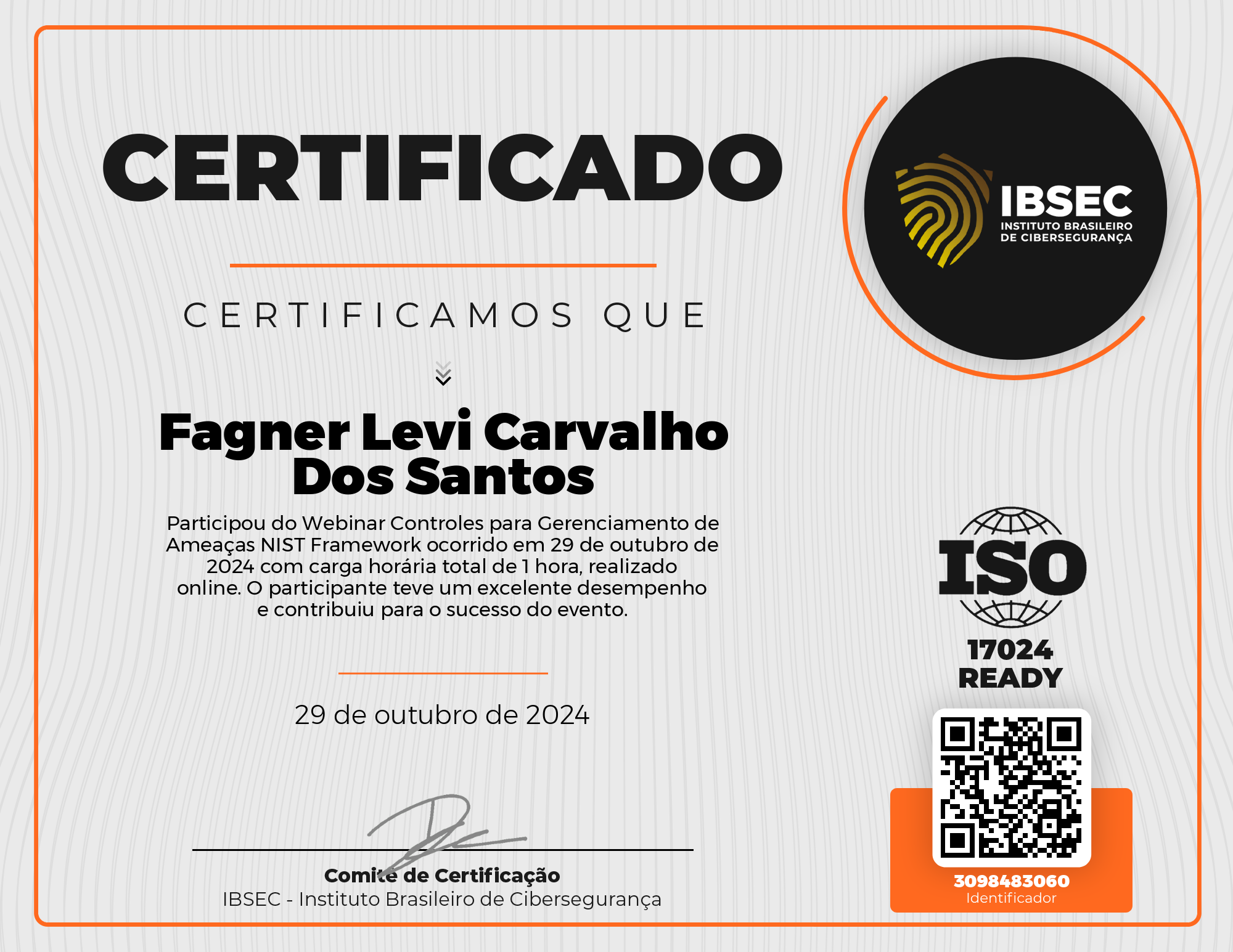 Certificado válido. Fagner Levi Carvalho Dos Santos concluiu a trilha de aprendizagem Controles para Gerenciamento de Ameaças NIST Framework.